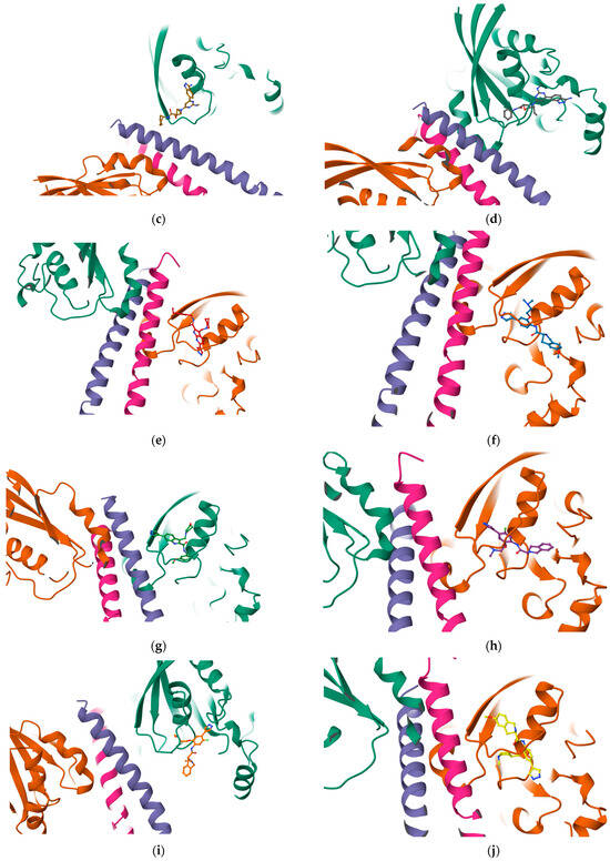 Protein–ligand complexes are visualized in PlayMolecule. The top CurPockets ranked based on Autodock Vina’s scoring function in each of the protein–ligand complexes: (a) (Velpatasvir)1S1C-ZINC000203686879 at C2; (b) 1S1C-ZINC000071318464 at C2; (c) 1S1C-ZINC000071296700 at C1; (d) 1S1C-ZINC000071315829 at C1; (e) 1S1C-ZINC000073170040 at C2; (f) 1S1C-ZINC000058568630 at C2; (g) 1S1C-ZINC000073196364 at C1; (h) 1S1C-ZINC000058591055 at C2; (i) 1S1C-ZINC000058568675 at C1; (j) 1S1C-ZINC000058574949 at C2.