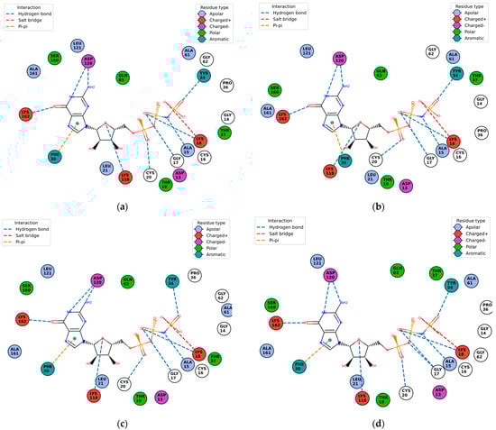 The results suggest that C2 is the best-ranked pocket ID for the complexes. The ligands for C2 are as follows: ZINC000071318464, ZINC000073170040, ZINC000058568630, ZINC000058591055, and ZINC000058574949. The ligand ZINC000071318464 is the only one that is considered as an intermediate in its bioactivity class; the rest are active (see Table 5). The five ligands that have the best scoring Vina for C2 all have the following structural properties embedded in their MACCS keys gathered from feature importance on the selected model. Figure 10 shows the contact residues of the complexes at the docked C2 site, which shows the H-bond, π–π, and salt bridge interactions between the residues and ligands [65]. The following residues interacting for velpatasvir at chain sequence B revealed the H-bond interactions at −ASP120, +LYS162, +LYS118, CYS20, GLY17, non-polar ALA15, +LYS18, and aromatic TYR34. π–π interaction was observed on the aromatic ring for PHE30. Hydrophobic interactions for the residues ALA161, LEU121, ALA61, LEU21 GLY62, and PRO36 were also observed. H-bond interactions are key in binding specificity while hydrophobic interactions contribute to binding affinity. The mobility and functional orientation of the hydrogen bonding hydrogens are of great pharmacological interest for influencing ligand bindings [66]. For the rest of the five screened ligands that show favorable energy at C2, such as ZINC000071318464, consistent residues paralleling that of velpatasvir on chain sequences B and Y were observed. Immune cells that are activated are dependent on enough SER and differentiation of T cells. GLN is essential for cell proliferation and immune system cells as GLN is a precursor in amino sugars and nucleotides. CYS availability has a key role in T cell functions because T cells do not have enzymes converting MET to CYS [67].