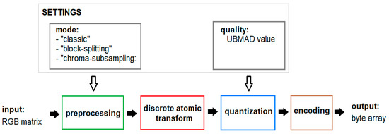 The DAC algorithm is based on the classic lossy image compression approach, involving discrete data transform, quantization and encoding. Figure 1 shows its main stages [33] under the assumption that it is applied to conventional RGB color images or other types of three-channel data represented as RGB images.