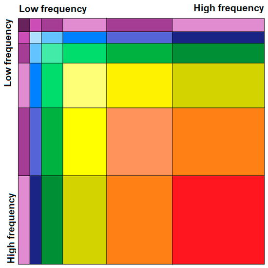 Next, a discrete atomic transform (DAT) is applied. DAT is a discrete wavelet transform based on the application of V.A. Rvachev [35]’s atomic functions, ups(x). The output of this step is a set of matrices of DAT coefficients. Their number is equal to the channel count of the source image. Each of these matrices consists of blocks that contain DAT coefficients corresponding to specific frequency band. In Figure 2, a sample structure is shown.