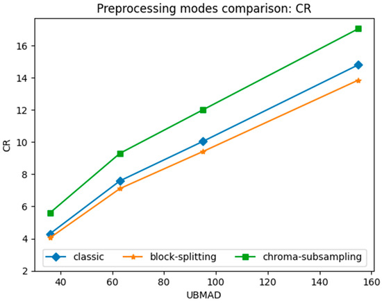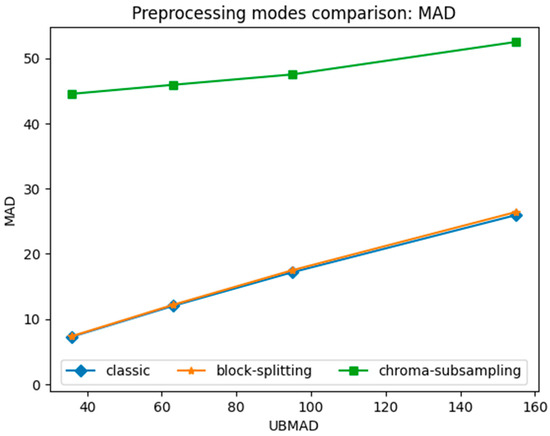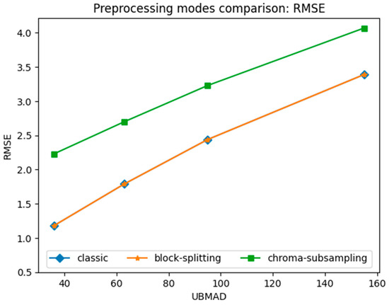 Further, for each UBMAD, the best compression is provided by the “chroma-subsampling” mode of the DAC algorithm. However, the quality loss measured by the MAD, RMSE and PSNR indicators is larger than for other modes. Comparing the source and decompressed samples, one can see that distortions are hard to see for a human eye (Figure 15). In other words, visually lossless compression is obtained when UBMAD is not greater than 155. Taking into account memory expense reduction (Figure 14b) in combination with the minor impact on the classifiers’ performance, this preprocessing mode of DAC can be recommended for application on digital photos and other types of still-image compression.