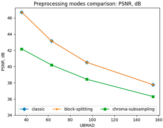 - the “chroma-subsampling” mode produces greater distortions than “classic” and “block-splitting”, but a higher compression ratio is provided;