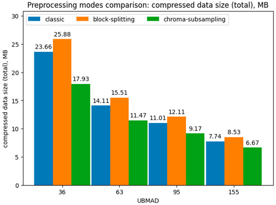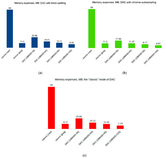 The comparison of memory expenses required for storing source and compressed data: (a) the “block-splitting” mode; (b) the “chroma-subsampling” mode; (c) the “classic” mode.