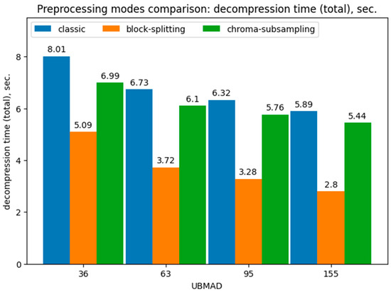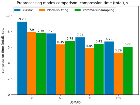 Table 1, Table 2 and Table 3 and Figure 4, Figure 5, Figure 6 and Figure 7 show the dependence of averaged lossy compression performance indicators and total time expenses on the UBMAD parameter. In addition, Figure 8, Figure 9 and Figure 10 allow for comparison of the time and memory expenses.