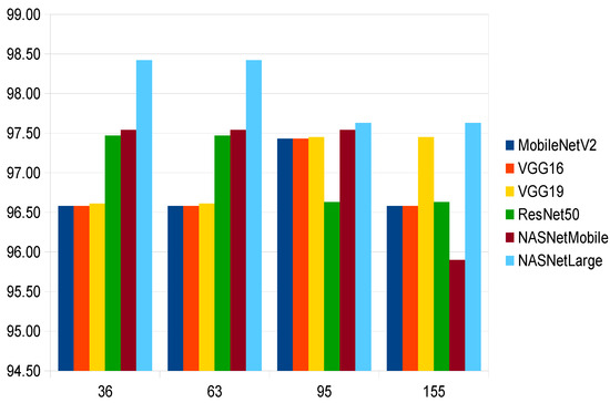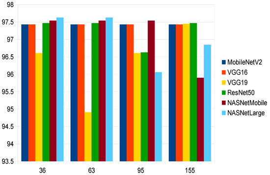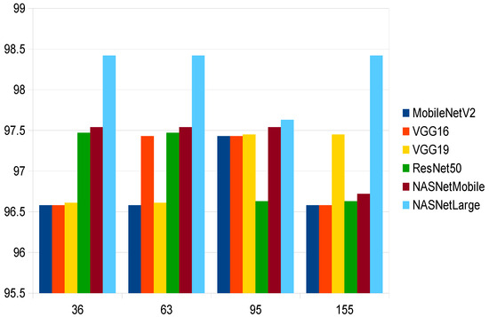 Analyzing the data in Table 4, Table 5 and Table 6 and Figure 11, Figure 12 and Figure 13, we see that, in all cases, the percentage of those correctly classified is less than 100%, which, in general, indicates the expected negative impact of distortions produced by the DAC algorithm. Meanwhile, the percentage is higher than 94%, which means that the effect of quality loss can be considered as insignificant. Moreover, the difference between the computed classification performance indicators is minor. These results might be explained by such models’ features regarding depth and the number of parameters. Indeed, data in Table 7 show that the considered networks are deep.