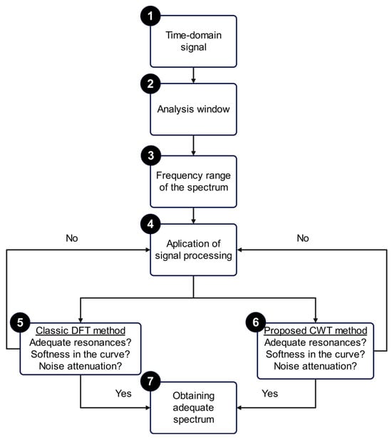 In step 1, the aim is to record the signal in the time domain, including the transient signal. In step 2, once the signal is in the time domain, an analysis window is selected to study only the transient signal; the window must contain the entire transient. Step 3 is employed to define the spectrum of the signal under analysis in the frequency domain and to characterize the transient signal. In step 4, the type of analysis is defined, such as CWT and DFT analysis. In step 5, DFT is used to study the resonance, the smoothness of the curve, and the noise. In Step 6, CWT is used to study the resonance, the smoothness of the curve, and the noise. In step 7, a comparison of the results obtained with DFT and CWT is performed to obtain the best spectrum.
