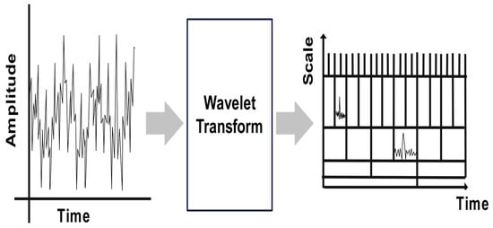 In the CWT, the basis function and window function concepts are combined to allow the problem to be solved. The CWT uses a mother wavelet (t) as the base function and decomposes a signal into different frequency components as a family of functions that are mother wavelet translations and dilations. Figure 3 shows the processing steps of the WT signal [10,32].