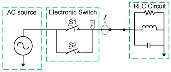 Figure 4 shows the circuit employed to measure voltage and current signals. This circuit considers an alternating current (AC) source connected to a load. The load was modeled as an RLC circuit composed of a resistor, an inductor, and a capacitance. In addition, an electronic switch is employed to create transient conditions with opening and closing sequences [33]. Moreover, Figure 4 shows that a voltage measurement identified as V and a current measurement identified as I are employed to record the electrical behavior of the circuit.