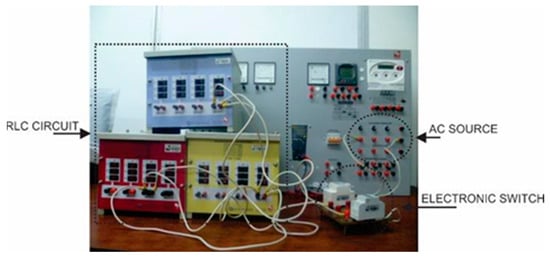Figure 5 shows the physical circuit employed for the experimental test. The figure shows the RLC circuit, the AC source, and the electronic switch. The tests were performed in the laboratory of the electrical and electronic engineering school of Universidad del Valle. The objective of the tests was to characterize the type of transient that occurs when connecting any type of RLC load or an electrical machine to the power system; this is essential to analyze the different electromagnetic transients present in the loads or an electrical machine connected to the power system. Voltage and current sensors with a frequency spectrum of up to 10MHz were employed for the tests, and an oscilloscope with a high sampling frequency was utilized for the recordings.