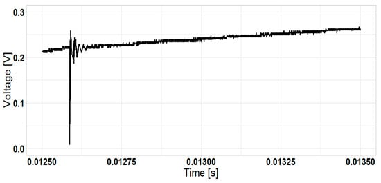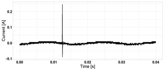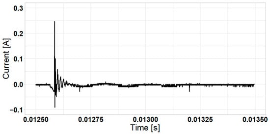 Approximately 80 sequences were performed for the test. Frequency spectrum analysis was performed for a bandwidth between 1 kHz and 5 MHz because most energy is concentrated in this frequency range. Figure 6 and Figure 7 show the temporal voltage and current signals analyzed. The pulses produced by the switching sequence are superimposed over the 60 Hz signal.