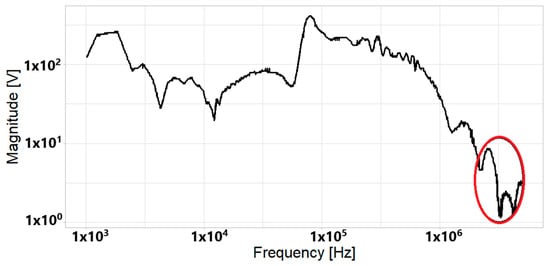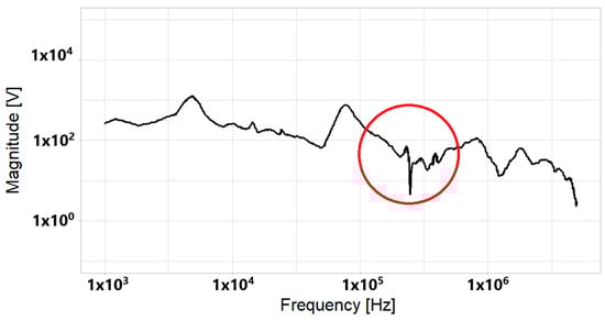 Figure 14 and Figure 15 show similar results to those mentioned above. The smoothing of the spectrum obtained with the CWT is highlighted in comparison to that of the DFT. Figure 14 and Figure 15 show a zoomed-in image of the marked zone of the spectrums in a bandwidth between 100 kHz and 1 MHz. These figures show some differences attributed to signal processing. The zones marked with the red circles show that the signal obtained with CWT is smoother than that obtained with DFT.