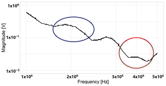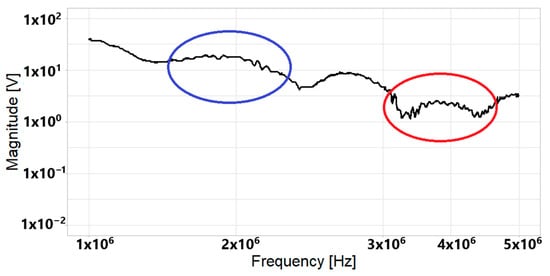 When zooming in on the marked zone of the previous figures, differences were found in the 1 MHz to 5 MHz range due to signal processing. Figure 12 shows a zoomed-in image of the zone marked in Figure 10. Figure 13 shows the CWT signal of the marked zones in Figure 11. Figure 12 and Figure 13 show two zones that are marked with blue and red circles. When the zones in the blue circles and red circles are compared, the results show that some disturbances are displayed in the signal obtained with DFT, while those disturbances disappear when using CWT.