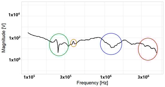 After comparing the DFT processing shown in Figure 10 and the CWT processing presented in Figure 11, some differences were found. The red circles in Figure 10 and Figure 11 show that the curve obtained with CWT presents a smoother spectrum than the obtained with DFT.