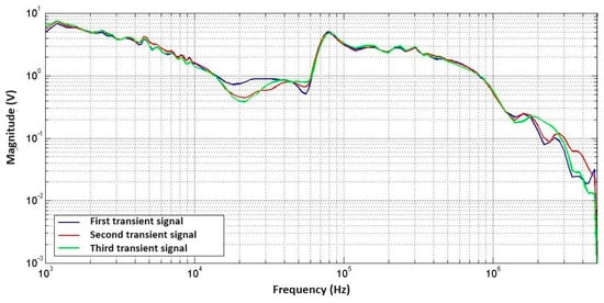 For the analysis of repeatability, three opening and closing sequences were executed in the same RLC circuit. The spectrum for this case should be the same, so the variations between the responses can be considered due to their data processing. Figure 22 and Figure 23 show the spectrums of three transient voltage signals obtained with DFT and CWT.