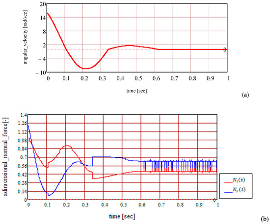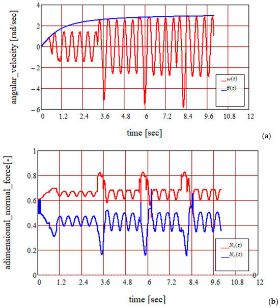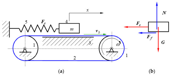 Friction is a phenomenon that occurs continuously in dynamic systems. One of the optimisation criteria in the synthesis of mechanisms consists of avoiding or diminishing shock [1,2]. If we consider cam mechanisms as an example, there are two types of shock: heavy shock, when the velocity of the follower presents finite discontinuities, and soft shock, when the acceleration presents finite discontinuities. Shocks are produced by discontinuities in the tangent and curvature of the cam. An extrapolation of this observation is the question concerning the effect of the friction force discontinuities on the evolution of dynamic systems, considering that the actual boundary surfaces of the elements from a mobile mechanical structure are under continuous change: during operation, deformations, pitting, etc., may occur, which affect well-defined surfaces with different tribological characteristics. The effects of friction can be demonstrated by experimental devices, of which the one presented in Figure 1a is widely used [3,4]. The advantages of using this dynamic system are, firstly, that the fact that the normal reaction has a constant value equal to the weight of the mobile body, and secondly, there is no risk that the constraint is cancelled, as occurs in some dynamic systems with unilateral constraints [5]. The system consists of two identical cylinders (1) with parallel axes that rotate with the same constant angular velocity, . A continuous conveyor belt (2) is bent over the cylinders and supported at the upper branch by a horizontal plane part (3) and moves at a constant velocity, . A body (4) of mass is placed on the belt and, therefore, it can move in a horizontal direction, and its position is fully characterised by the linear displacement , resulting in a system with one degree of freedom (1DOF). Dry friction exists between the body and the belt, characterised by the friction force, , where is the relative velocity between the belt and the body.