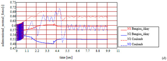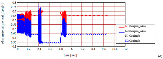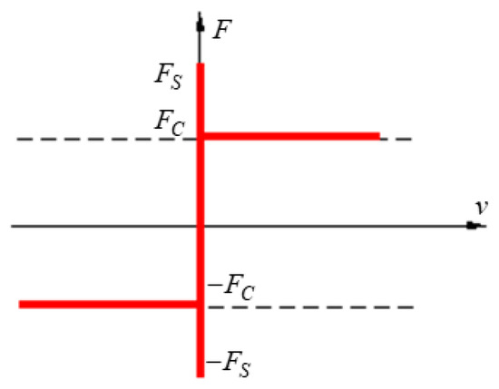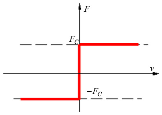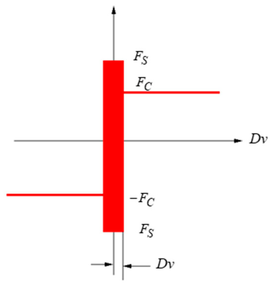 An extremely difficult task is choosing an adequate friction model to obtain the law of motion. In the literature, there are numerous friction models that are more or less complex [3,7,8,9]. Marques et al. [3] reviewed the main dry friction models. The earliest and simplest models are due to Amontons [10] and Coulomb [11], according to which the friction force is proportional to the normal reaction and opposes the relative motion. When the relative motion is zero, the function from Figure 2 becomes multi-valued and can take any value within the domain , as shown in the following expression: