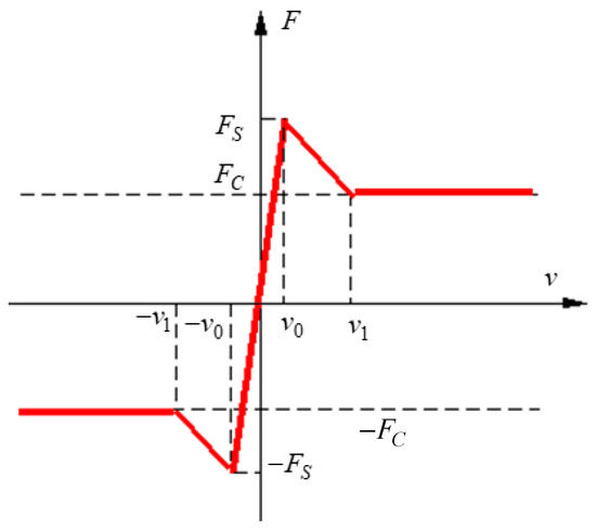 To overcome the mathematical difficulties concerning the multiple values that the friction force can take in the case when the velocity between the contacting points is zero, Karnopp [24] proposes a friction model where the relative velocity is considered zero for an entire interval, and the force should be evaluated for zero velocity. The following Karnopp model eliminates the discontinuities for zero velocity and is capable of highlighting the stick–slip phenomenon as shown in Figure 4: