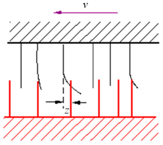 The mentioned models describe the friction force at a certain moment but cannot characterise phenomena such as pre-sliding displacement or frictional lag. To overcome this drawback, dynamic friction models were proposed and a first was proposed by Dahl [26,27]. The Dahl friction model assimilates the contact between the two rubbing surfaces as the contact between two brushes, one with rigid bristles and the other one with elastic bristles, which bend elastically due to relative motion; the deflection , shown in Figure 8, is defined by the following differential equation:
