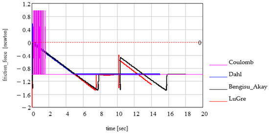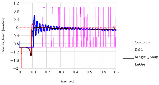 The equations of motion were integrated using Mathcad 14 software, applying the Runge–Kutta 4 formula [37,38] with constant step under the assumption that the body is initially at rest at the origin. The plots of the displacement are presented in Figure 9, and the variations of velocity are shown in Figure 10, comparatively, for the four friction models. The comparison of the friction forces for the four models is presented in Figure 11. Details from Figure 11 are presented in Figure 12, concerning friction force variations immediately after the start of motion.