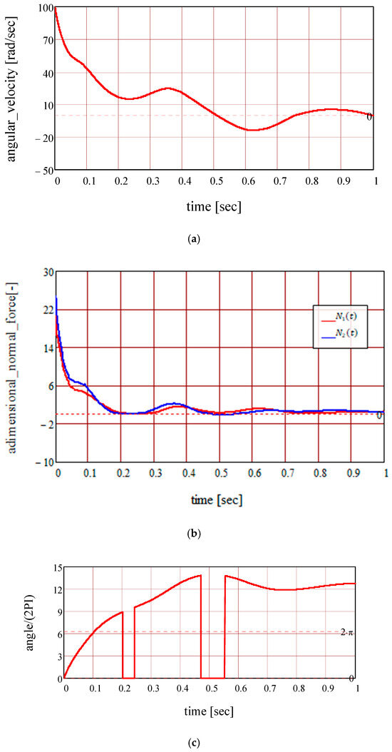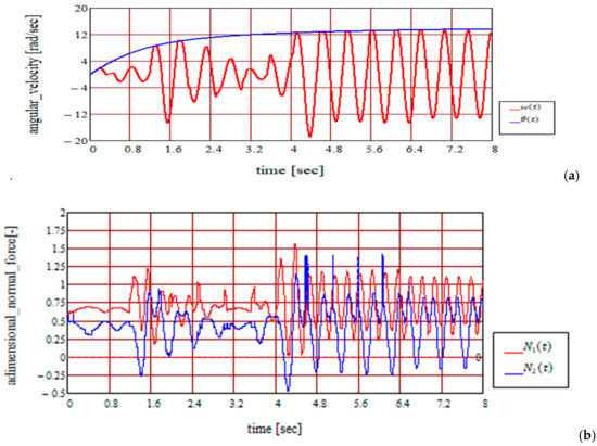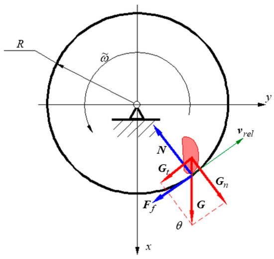 We aimed to experimentally highlight the qualitative aspects of the effects of dry friction in dynamic systems. Our research started from the observation that two forces act in the dynamic system from Figure 1: the conservative force, represented by the elastic force generated by the elastic element of the helical spring, and the dissipative force, represented by the friction force . The elastic force is considered rigorously proportional to the deformation of the spring. In fact, this aspect is difficult to obtain due to the non-linearities occurring in the coupling regions of the spring with the ground and with the mobile body, and due to the internal friction from the material of the spring, this actually being a Kelvin–Voigt body [39]. All these non-linearities will remove the dynamic model obtained under the hypothesis of elastic force–spring deformation proportionality from the accurate evolution of the actual system. For this reason, we proposed that the effect of dry friction be analysed based on the system from Figure 13 instead of the dynamic system from Figure 1. The new system consists of a circular ring of radius that rotates about a horizontal axis with the known angular velocity . Inside the ring, a small body that contacts the ring at a unique point is placed. Assuming that the relative velocity of the contact point from the body is oriented as shown in Figure 13, the next forces can be identified as acting upon the body: the body weight with its components (normal and tangential ) and the following reactions: the normal reaction and the tangential reaction (or the friction force).