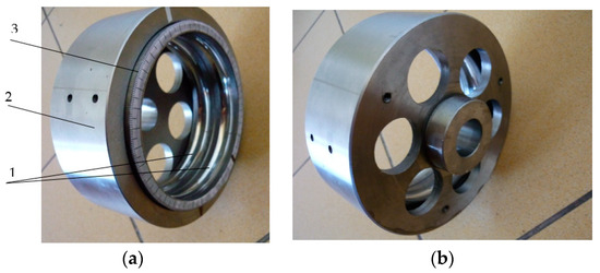 Ensuring the co-axiality of the bearing rings using the driving part: outer bearing rings 1, driving part 2, angular scale 3; (a) front view; (b) back view.