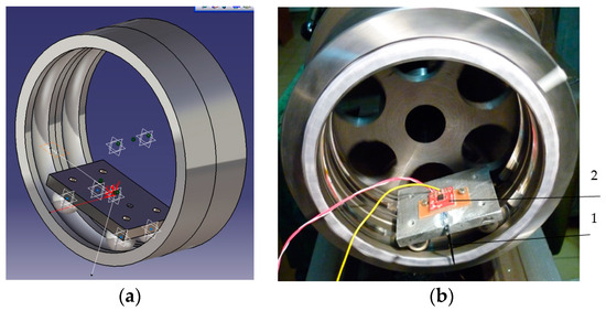 The design of the device is presented in Figure 17a and the actual device from the lab is shown in Figure 17b. One can see that on the mounting plate was attached pointer 1, needed for stipulating the position of the body with respect to the driving part. On the plate, acceleration sensor 2 was also attached by two screws.