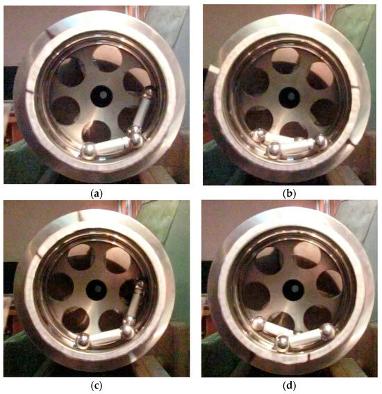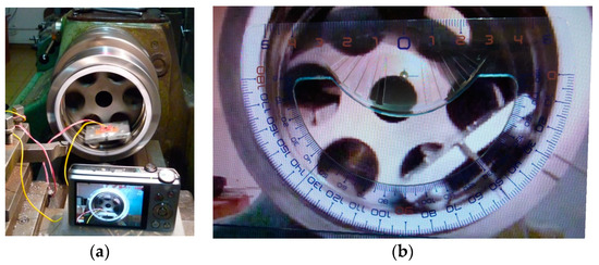 The device was mounted on the universal lathe chuck in order to drive it into motion with controlled angular velocity, as shown in Figure 18a. In the first stage, the motion was studied via optical methods. The motion of the body was video captured with a high-speed camera (240 frames/s), and then analysed by splitting into frames using QuickTime 7.7.9 software. It was noticed that the mobile body performs an oscillatory motion. Then, using an angular scale, the position of the body at the end of race (maximum amplitude) was precisely identified and, therefore, the absolute motion of the body was found.