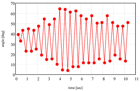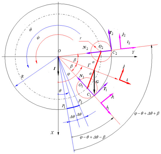 The dynamic model of the system from Figure 20 is presented in Figure 22. The mobile body consists of two identical spheres of radius rigidly connected by rods, and the distance between the centres of the spheres is .