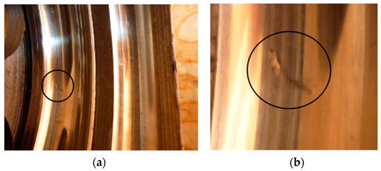 Surface of the back ring: (a) presence of wear on the race; (b) detail of the race wear (scratch).
