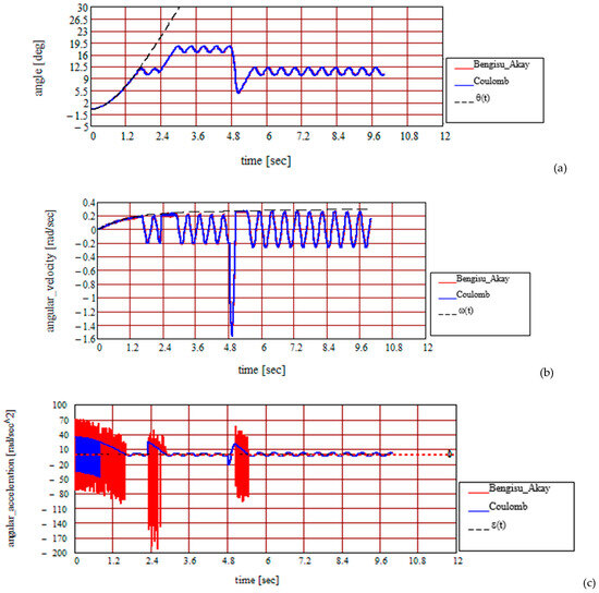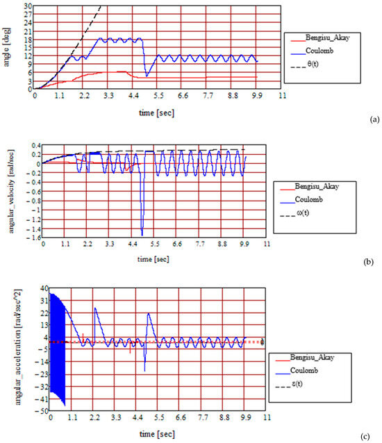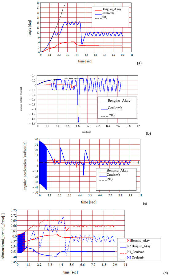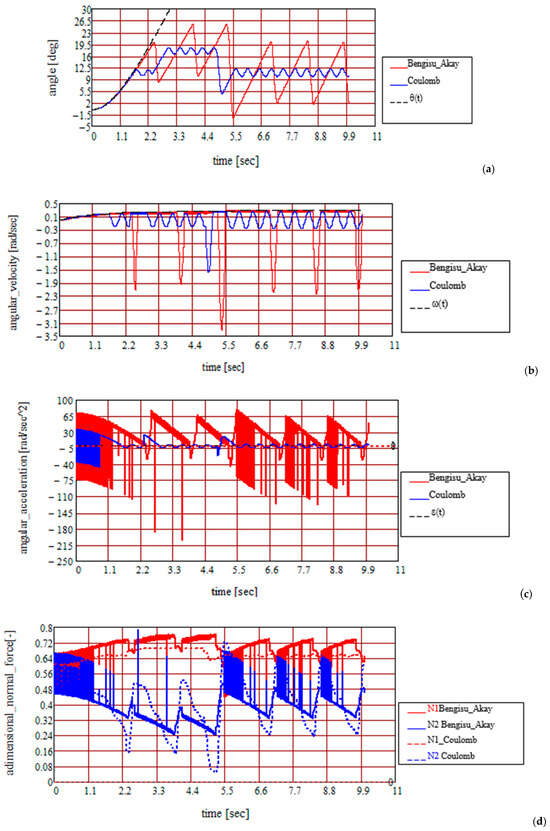 From Figure 9 and Figure 10 it can be noticed that, considering kinematical aspects, there is significant similarity between the Coulomb and Dahl models on one side and similarity between the Coulomb with stiction model and the LuGre model on the other side. Regarding the friction force, Figure 11 reveals major differences among all of the considered models. From Figure 12, it can be remarked that these variances are more pronounced immediately after the start of motion. It should be mentioned that the graphs obtained for the Dahl and LuGre models are identical to the ones from the article of Marques et al. [3], confirming the correctness of the models and the methodology of numerical integration.