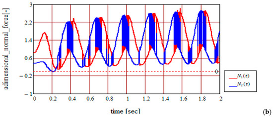In most of the papers that consider dry friction, when the relative velocity exceeds a certain value (the transition velocity ) the coefficient of friction becomes constant and equal to the kinetic friction coefficient. In our case, the kinetic coefficient of friction presents periodical jumps and, additionally, the presence of two contacts may lead to many situations: the same kinetic coefficient of friction in both contacts, different values in the two contacts, or a contact with stiction and the other with sliding.