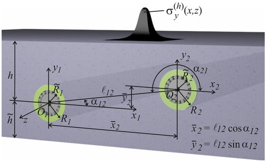 Distance to the upper boundary of the layer y = h, and distance to the lower boundary of the layer . The second pipe is located relative to the first at a distance of ℓ12 and at an angle of α12.
