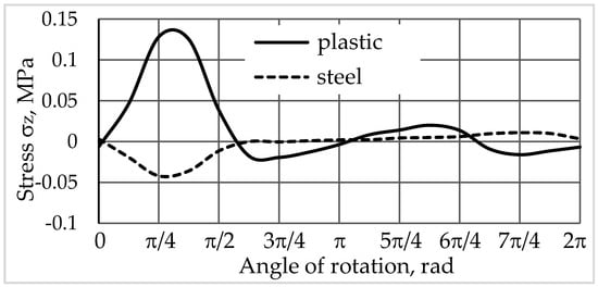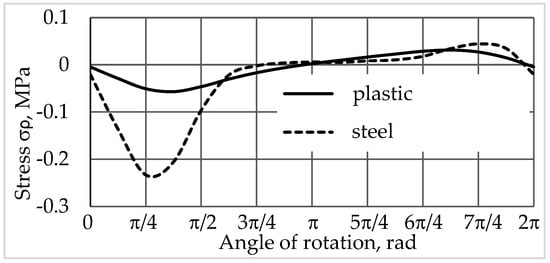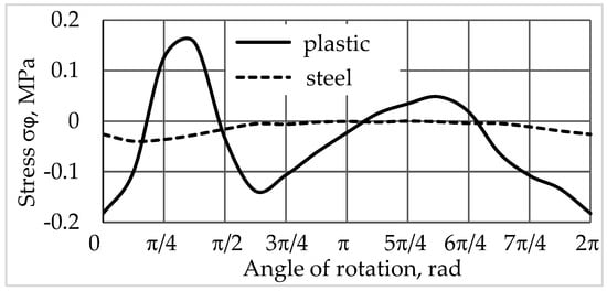 Changing the material of cylindrical pipes to plastic changes the stress state on the inner surface of the pipe. Figure 4 shows the stresses on the inner surface of the pipe at L12 = 50 mm depending on the material.