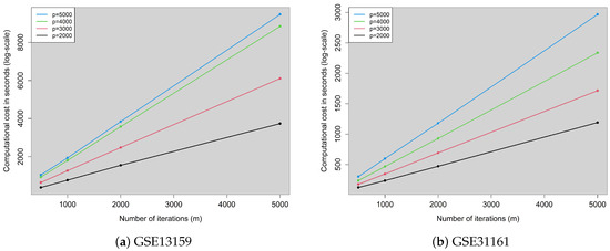 Computational cost of the rmdp() function with parallel computations as a function of the number of iterations (m) for different dimensionalities. (a) GSE13159. (b) GSE31161.