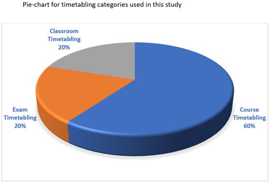 All the different aspects of timetabling emphasis on course timetabling, classroom timetabling, and exam timetabling are covered in this analysis. A visualised pie chart is below to demonstrate the distribution of the timetabling categories: course, classroom, and exam timetabling (Figure 2).