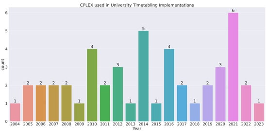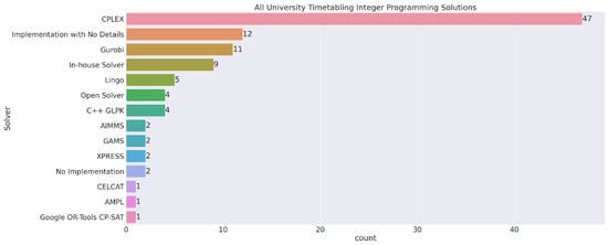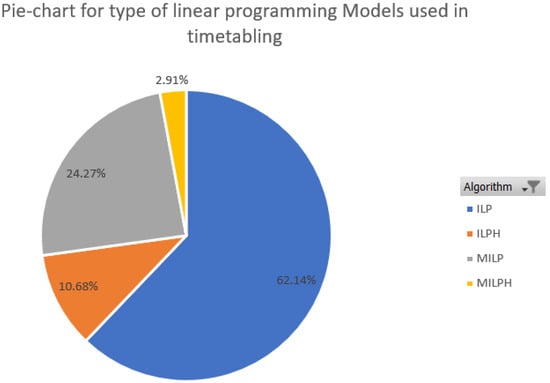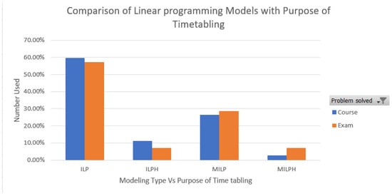 Further in our comparison, Figure 4 shows the types of linear programming models used for particular purposes of timetabling, namely, classroom, course, and exam. Only three timetabling purposes were considered as all other categories are subparts of these three main categories. For example, the lecturer timetable comes under the course timetable. Further to this, we consider classroom timetables as course timetable. The figure identifies that mostly course timetabling was performed with ILP and very few researchers considered MILPH for any type of timetabling. MILPH was used when a large number of subjects were considered, which was very rare, as shown in Figure 4.