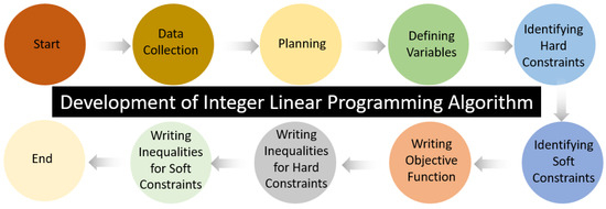The general strategy for writing a linear programming algorithm is summarised in Figure 5, based on the papers reviewed for this work. The details of the steps involved in the linear programming algorithm are provided in the following subsections. For improved readability, some steps are combined in the discussion below.