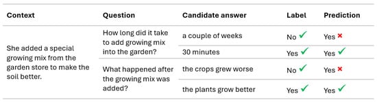 Temporal text refers to a text that contains temporal features (time, events, and relations). The presence of these features can be explicit or implicit, making the task more challenging. Moreover, comprehending temporal common sense is crucial for understanding the inherent temporal aspects of a text. The term “common sense” can be defined as “the basic level of practical knowledge and reasoning concerning everyday situations and events that are commonly shared among most people” []. Although humans possess this ability as part of their cognitive intelligence, it is challenging for machines to acquire it. For example, understanding temporal common sense enables people to understand the order in which events occur. Humans innately understand that certain events precede others, such as falling ill before dying. However, machines face difficulties in acquiring this understanding, as they require complex algorithms and programming to infer the chronological sequence of events. In addition to event ordering, temporal aspects include the event duration. Humans find it relatively easy to predict the duration of activities, such as eating, opening a door, or walking. However, the limited datasets about the temporal understanding or extraction that are currently available primarily involve unusual events or unusual durations, posing a significant challenge for machines to predict the duration of routine events. There are more examples, including the frequency of an event; humans know that lunch happens once per day. Additional temporal aspects will be discussed later in this study, including the typical time that events occupy and the situation of an event. Therefore, the task of temporal common sense understanding (TCU) is complex. Figure 1 illustrates an example of a TCU challenge and how a model can fail to validate the correct answer.