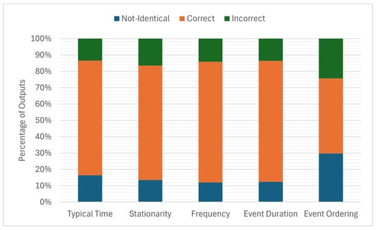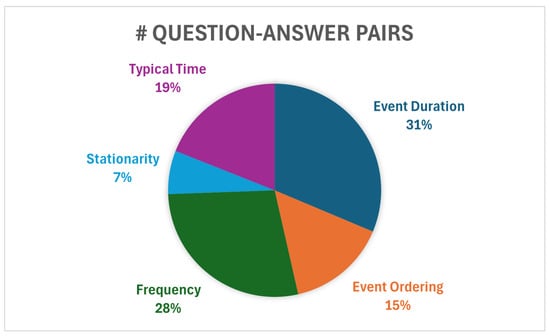 Drawing inspiration from traditional question–answer (QA) systems, where question classification is crucial for high performance, based on Huange et al. [] and Kolomiyets et al. [], our approach adapts this methodology for a modern context. Unlike QA systems, where classification directly aids in generating answers, here, it serves as a diagnostic tool. This distinction is key, emphasizing that our goal is not to classify for the sake of classification but to deepen our understanding of PLMs’ handling of temporal information.