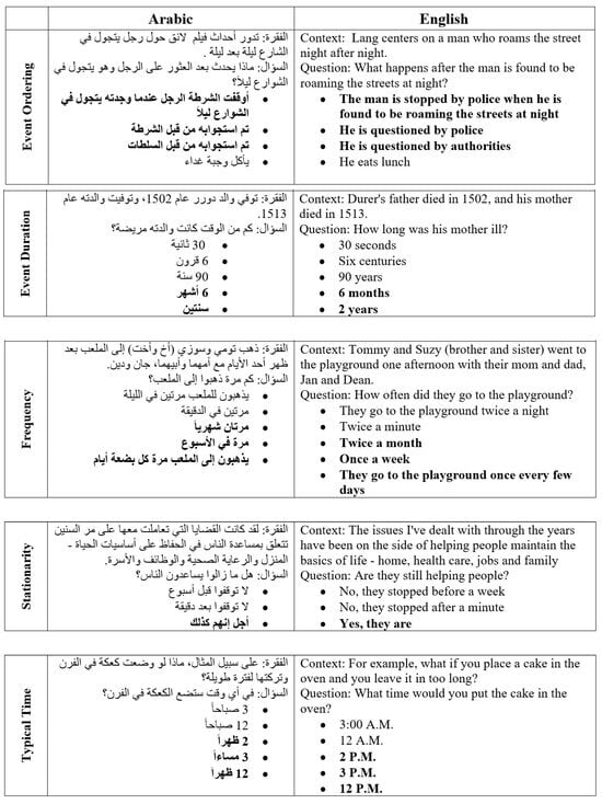 The MC-TACO dataset [] was selected for translation into Arabic because of several key factors that align with the research objectives. First, MC-TACO is recognized, to the best of our knowledge, as the only dataset that encompasses a wide range of temporal characteristics, making it exceptionally relevant for our study of TCU. Second, the dataset’s straightforward structure and use of simple sentences render it particularly amenable to translation, ensuring the preservation of semantic integrity during this process.