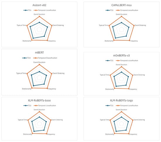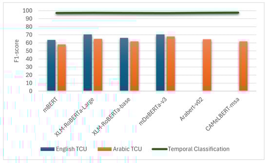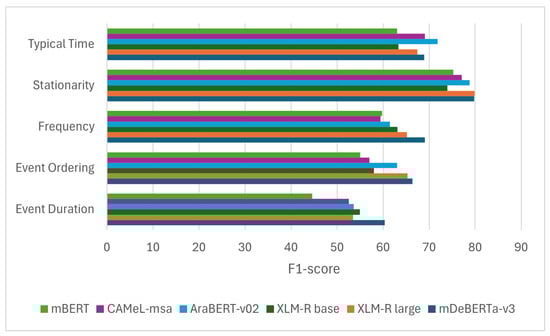 Figure 4 presents the outcomes of the various models when applied to the Arabic dataset. The F1 score is displayed for each temporal aspect, facilitating an assessment of the effectiveness of each model. The figure reveals several significant findings, which are summarized below: