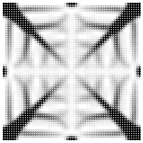 Despite the significant progress made on the topology optimization implemented with mesh-free approaches, there are still difficulties. First of all, the influence domain of nodes might overlap with each other in the meshless method. As the nodal variables describe the existence or absence of the nodes and their surroundings, it is challenging to precisely define the structural boundary. Figure 1 depicts a typical topology optimization result acquired from Ref. [21]. Visually, the distribution of nodes or Gauss points makes it difficult to determine the resulting boundary, which forms a barrier in widespread engineering applications. Recently, Fu et al. [31,32] proposed a new topology optimization algorithm named the Smooth-Edged Material Distribution for Optimizing Topology (SEMDOT), capable of directly generating smooth boundaries without the need for post-processing methods. The SEMDOT algorithm assigns extra grid points to elements and pursues the solid and void design of grid points rather than elements in traditional methods such as SIMP and BESO. As the number of grid points is much higher than that of elements, a smooth boundary can be formed during optimization. Also, the SEMDOT approach has been extended into the additive manufacturing technique [33,34,35], natural convection heat transfer optimization problems [36], and sheet metal forming process problems [37]. To address the mentioned difficulties, the current work develops SEMDOT in the framework of a meshless analysis approach, aiming to optimize the continuum structure without further graphics post-processing techniques. Furthermore, in typical element variables topology optimization methods, boundary zig-zag phenomena are often observed [38,39]. In contrast to the existing meshless-based topology optimization, the theoretical contribution of the present paper is to emphasize the application of regional variables instead of nodal or Gaussian point variables. Furthermore, a non-penalization version of the SEMDOT approach is developed in the meshless framework, enabling 0/1 discrete solutions as opposed to the penalization scheme. The proposed method ensures the preservation of smooth boundaries, also overcoming the zig-zag boundary phenomenon typical of several optimization approaches.