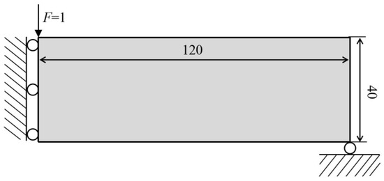 This section will present representative 2D and 3D numerical examples to illustrate the applicability of the proposed SEMDOT approach in the framework of the meshless method. In all examples, the geometric parameters, material properties, and loads are dimensionless. In each integration cell, a 4 × 4 Gauss quadrature is utilized to determine the stiffness of EFG. The solutions are achieved using a linear basis function with the cubic spline weight function. In the MMA optimizer, a move limit of 0.05 is adopted. In Equation (20), the parameter β starts at 1 and is increased by 0.5 for each iteration while the maximum iteration is set to 100 to maintain a proper balance between the accuracy and computational cost. All numerical examples are conducted by means of the software MATLABTM.