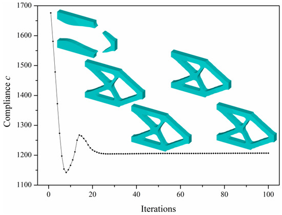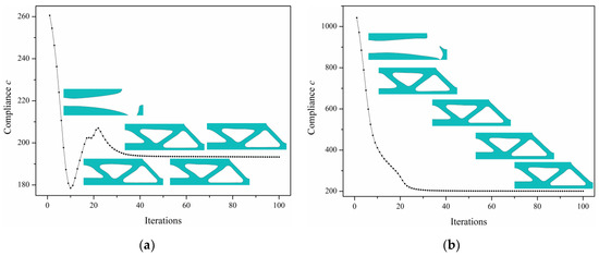 As shown in Figure 6, it can be seen that the optimized structures resemble each other. It is possible to obtain a smooth and identifiable boundary in both circumstances. In the two cases, convergence processes of the objective function exhibit distinct properties. When p equals 3, the initial compliance starts with a relatively high value, as shown in Figure 7b. The compliance rapidly falls in a reasonably low number of iterations and converges to a nearly constant value. When the non-penalization scheme is employed, the compliance value is relatively lower. With a sharp decline, the curve appears to encounter a bump. The curve quickly goes up and then reaches a plateau until convergence.