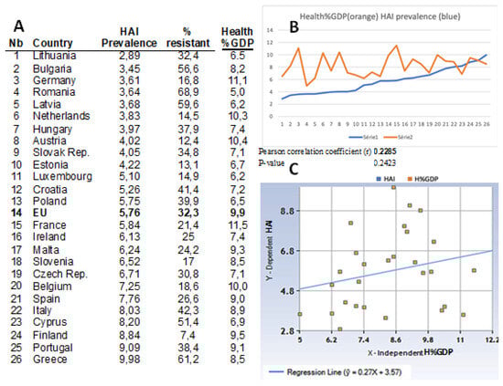Correlation study between Hospital-Associated Infections (HAIs, with their percentage of resistance to antibiotics) and health expenditure as a percentage of GDP (H%GDP) in European Community countries (data from []).