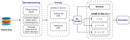 Figure 5 depicts the overall pipeline used in this study for performing the mortality and LOS prediction task. All the models have been trained on samples from all days included in this dataset for mortality prediction, irrespective of the number of days to outcome, but for the case of the length of stay prediction, we first split the patients in equally sized bins based on their LOS distribution, thus maximizing entropy and avoiding bias for the training data. In order to predict survivability results given a patient’s vital signs, classification methods were used, taking into account five features (temperature, respiratory rate, WBC, MAP, and lactate levels) and the mortality state of each patient, for both binary and multi-class classification. We evaluated the performance of the classifiers by performing cross-validation (5-fold cross validation) and calculating the Receiver-Operator Characteristic (ROC) curves, the Area Under the Curve (AUC), accuracy, balanced accuracy, and F1 score. The optimum combination of features thus obtained was then used to train various machine learning classification models. The trained models were then tested based on three different methods, with each having its own strengths. Five-fold cross validation was utilized to assess the predictive ability and statistical significance of the models. Assessment of the developed models was performed based on different metrics, whose mean and standard deviation are reported in Figure 5. A further detailed account of the step-by-step procedure is presented below.