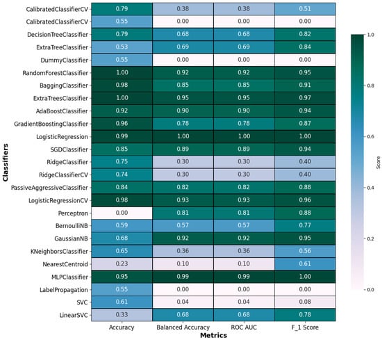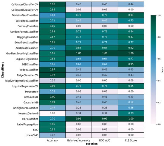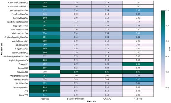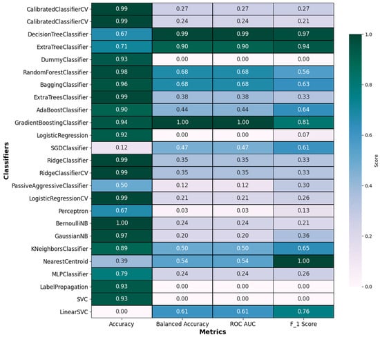 The F1 score, measuring the balance between precision and recall, was led by Nearest Centroid (0.365), Gradient Boosting Classifier (0.297), and Decision Tree Classifier (0.354). While Nearest Centroid showed relatively modest performance in other areas, it demonstrated superior performance for balancing precision and recall (Figure 9).