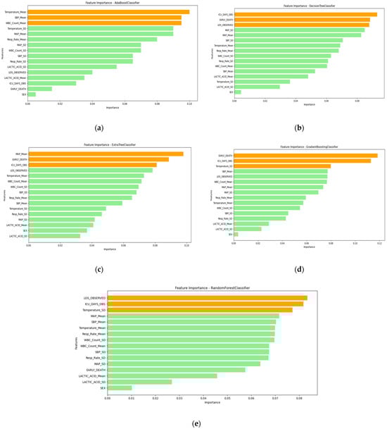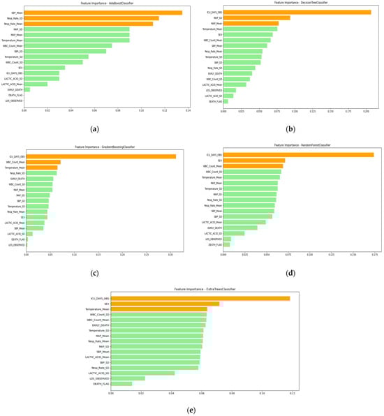 Feature importance study for length of stay (LOS) prediction less than 4 days by various classifiers (a) adaboost; (b) decision tree; (c) gradient boosting; (d) random forest; (e) extratrees. The color orange represents the first three best predictors and the green the others.