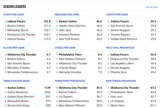 - NBA Advanced Stats. Available online: https://www.nba.com/stats/teams/ (accessed on 22 March 2025).