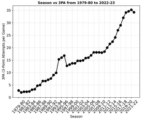 Initially, it is necessary to define the seasons from which the data will be collected. Figure 2 demonstrates the impact that the metrics related to the 3 points have gained too much importance to be a key factor when it comes to obtaining data [21]. As can be observed, from the 2009–2010 season to the 2017–2018 season, the number of triples per season has almost doubled. As an example, in the 2024 season, the team in first place in the Western Conference is the one with the highest shooting efficiency from the three-point line in the entire league. It might not be worth considering earlier seasons because the statistics related to 3-pointers would not have the desired impact when training the model. Data were then taken from the 2015–2016 season to the recent 2023–2024 season; in this way, it will be possible to ensure when training the model that the statistics related to the 3 points will have the proper impact, and the model will have eight seasons to train which conveys robustness concerning the dataset.